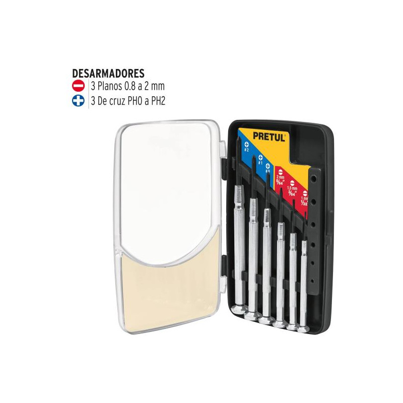 Desarmadores Juegos 6 Pza Electronica y Presicion Truper 21381 Punta de acero al cromo vanadio 2X más resistente al desgaste que las de acero al carbono Mango antiderrapante con cabeza giratoria que permite mayor control Para electrónica y trabajos de precisión Estuche organizador que facilita su almacenamiento
